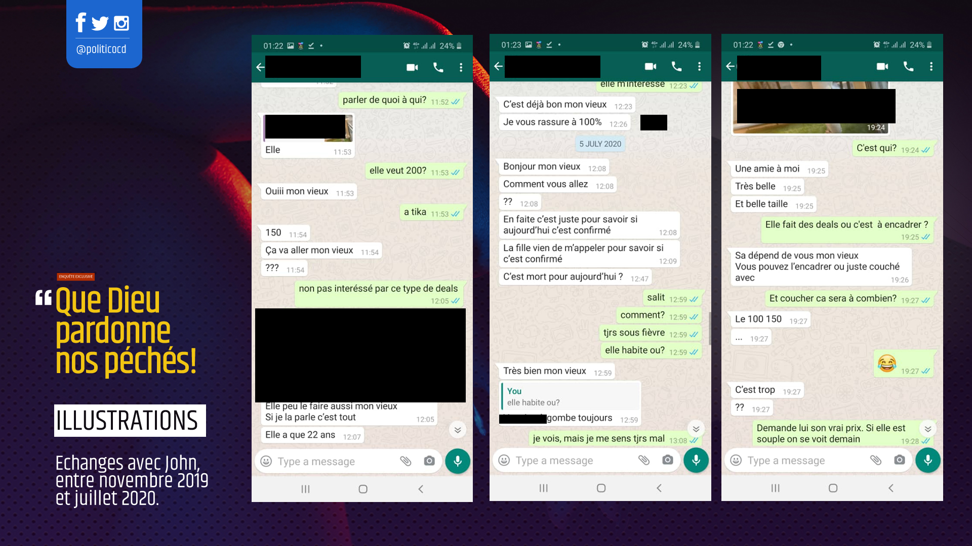 Je suis l’invité de John et son « amie ». « Bonsoir mon vieux. On vous attend depuis… », me lance-t-il en me voyant. Aussitôt assis, il m’introduit : « la voilà mon vieux, c’est Nathy ». « Enchanté », je lance à la jeune dame qui est aussitôt mal à l’aise lors que la conversation est abordée en langue de Molière. A vraie dire, je ne connais pas Nathy. John m’a envoyé une de ses photos il y a quelques jours, affirmant qu’il s’agit « d’une de ses amies », qu’« elle fait des +deals+ ». Le « deal », retenez-le bien, sera le maître-mot de notre histoire, nous conduisant au cœur d’un univers aux pratiques insoupçonnées.